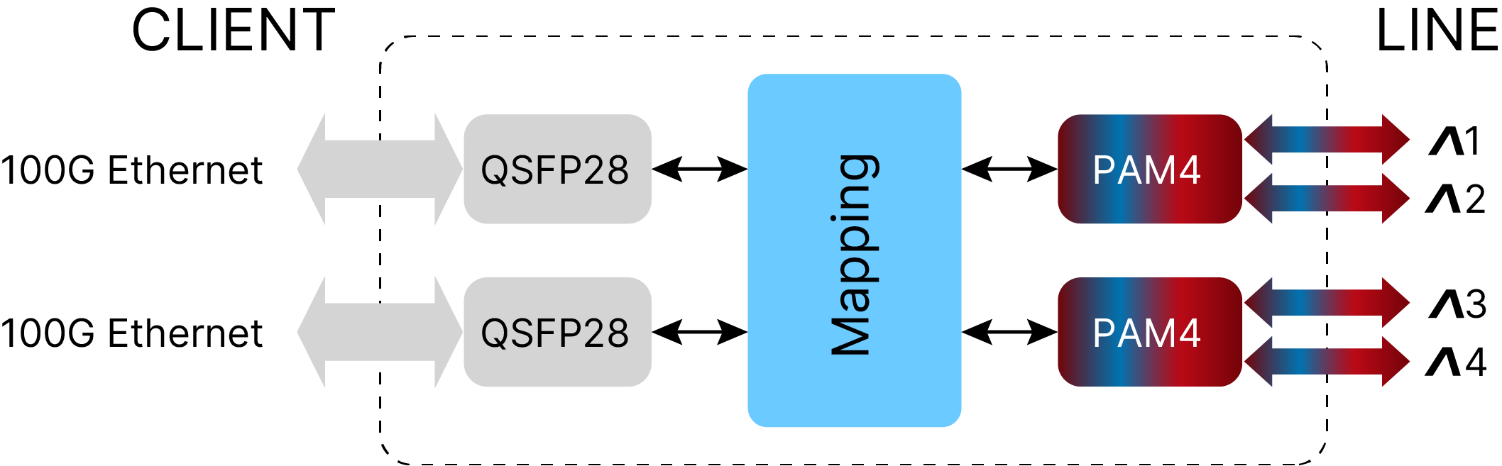 Transponder GPTN-100G-2CH to 2-kanałowa karta transpondera dla przepływności 100Gbit/s. Porty QSFP28 wspierają moduły LR4 oraz SR4, a porty liniowe QSFP28 moduły PAM4. Urządzenie zapewnia elastyczną transmisję protokołu: